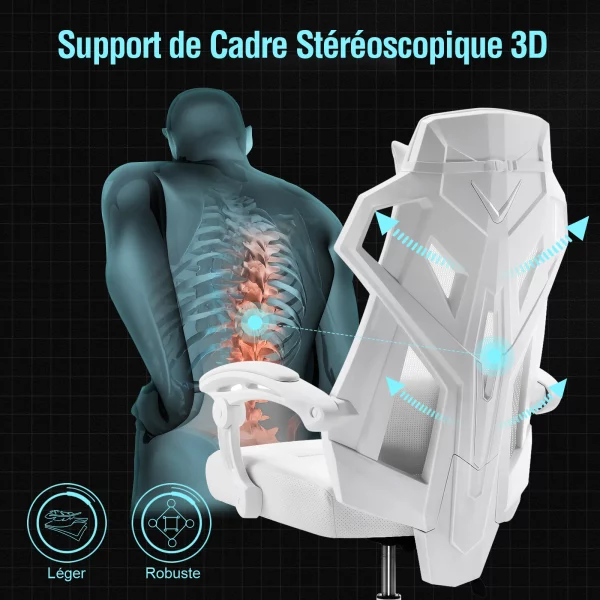 Cadre 3D stéréoscopique ergonomique:Le dossier ergonomique 3D stéréoscopique est conçu pour s’adapter à l’anatomie humaine et fournir un soutien confortable pour vous garder concentré et détendu même pendant un travail ou un jeu plus long. Cette chaise de jeu de style mecha sera un merveilleux ajout à votre pièce.